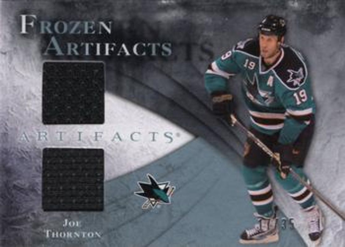 The Joe Thornton 2010 Upper Deck Artifacts #FA-JT Frozen Artifacts Blue /35 card is 1 of 28 Joe Thornton's card variations in the 2010 Upper Deck Artifacts set being tracked by Sports Card Investor, including #155 Base /699, #64 Base /699, #64 Emerald /50, #155 Emerald /50, and #155 Gold /35.