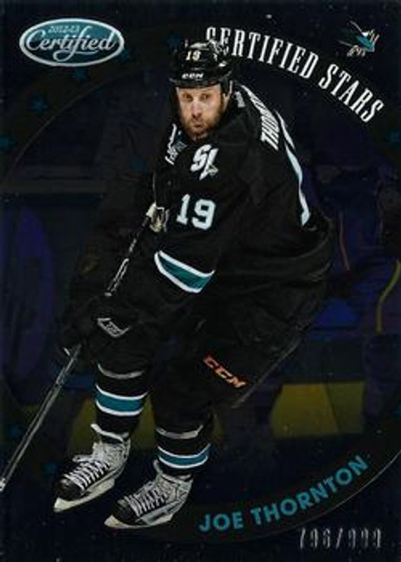 The Joe Thornton 2012 Certified #S19 Certified Stars /999 card is 1 of 6 Joe Thornton's card variations in the 2012 Certified set being tracked by Sports Card Investor, including Stars Materials Mirror Red Jersey /100, Stars Materials Mirror Blue Prime /50, Stars Materials Mirror Gold Patch /25, Stars Materials Mirror Emerald Strap /5, and Stars Materials Mirror Black Tag /1.