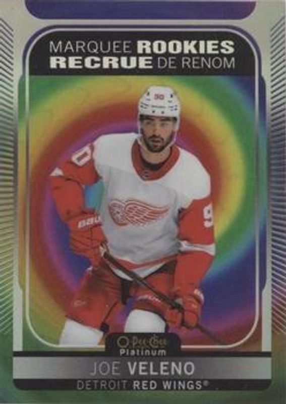 The Joe Veleno 2021 O-Pee-Chee Platinum #225 Rainbow Color Wheel Rookie card is 1 of 39 Joe Veleno's card variations in the 2021 O-Pee-Chee Platinum set being tracked by Sports Card Investor, including Base, Black Shield (Marquee Rookies), Blue Surge, Matte Pink, and Neon Yellow Surge.