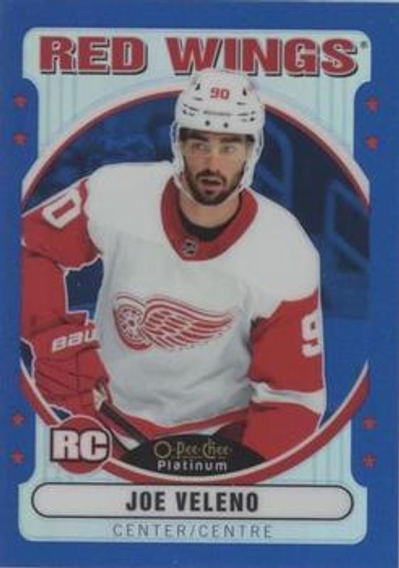 The Joe Veleno 2021 O-Pee-Chee Platinum #R-81 Retro Rainbow Blue /199 Rookie card is 1 of 39 Joe Veleno's card variations in the 2021 O-Pee-Chee Platinum set being tracked by Sports Card Investor, including Base, Black Shield (Marquee Rookies), Blue Surge, Matte Pink, and Neon Yellow Surge.