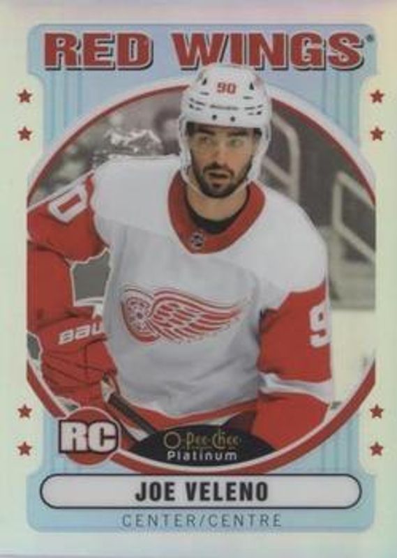 The Joe Veleno 2021 O-Pee-Chee Platinum #R-81 Retro Rainbow Rookie card is 1 of 39 Joe Veleno's card variations in the 2021 O-Pee-Chee Platinum set being tracked by Sports Card Investor, including Base, Black Shield (Marquee Rookies), Blue Surge, Matte Pink, and Neon Yellow Surge.