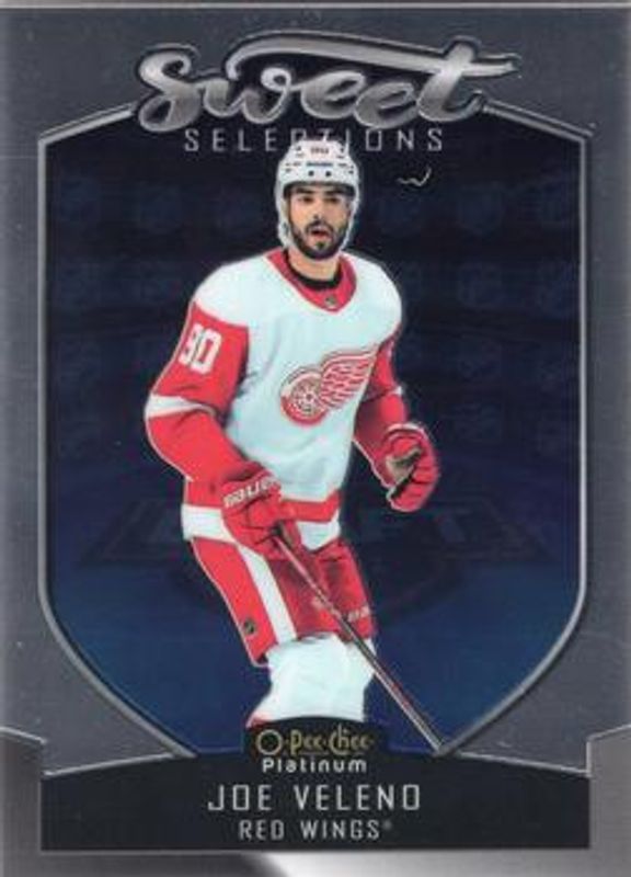 The Joe Veleno 2021 O-Pee-Chee Platinum #SS-14 Sweet Selections Rookie card is 1 of 39 Joe Veleno's card variations in the 2021 O-Pee-Chee Platinum set being tracked by Sports Card Investor, including Base, Black Shield (Marquee Rookies), Blue Surge, Matte Pink, and Neon Yellow Surge.