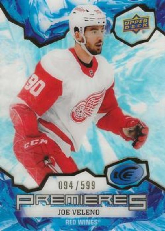 The Joe Veleno 2021 Upper Deck Ice #220 Blue /599 Rookie card is 1 of 37 Joe Veleno's card variations in the 2021 Upper Deck Ice set being tracked by Sports Card Investor, including #220 Base /999, #124 Base /999, #124 Ice Blue, #124 Jersey, and #124 Lavender.