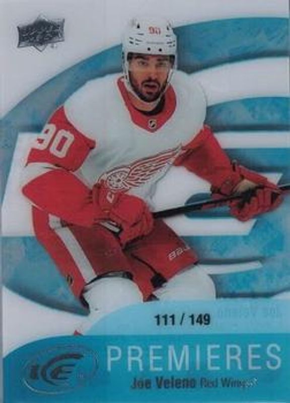 The Joe Veleno 2021 Upper Deck Ice #3 Ice Premieres Retro /149 Rookie card is 1 of 37 Joe Veleno's card variations in the 2021 Upper Deck Ice set being tracked by Sports Card Investor, including #220 Base /999, #124 Base /999, #124 Ice Blue, #124 Jersey, and #124 Lavender.