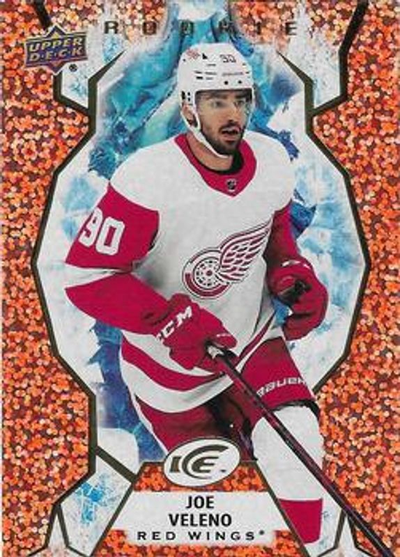 The Joe Veleno 2021 Upper Deck Ice #124 Orange Rookie card is 1 of 37 Joe Veleno's card variations in the 2021 Upper Deck Ice set being tracked by Sports Card Investor, including #220 Base /999, #124 Base /999, #124 Ice Blue, #124 Jersey, and #124 Lavender.