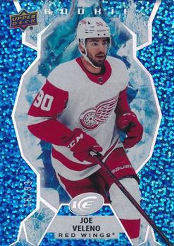 The Joe Veleno 2021 Upper Deck Ice #124 Royal Blue /99 Rookie card is 1 of 37 Joe Veleno's card variations in the 2021 Upper Deck Ice set being tracked by Sports Card Investor, including #220 Base /999, #124 Base /999, #124 Ice Blue, #124 Jersey, and #124 Lavender.