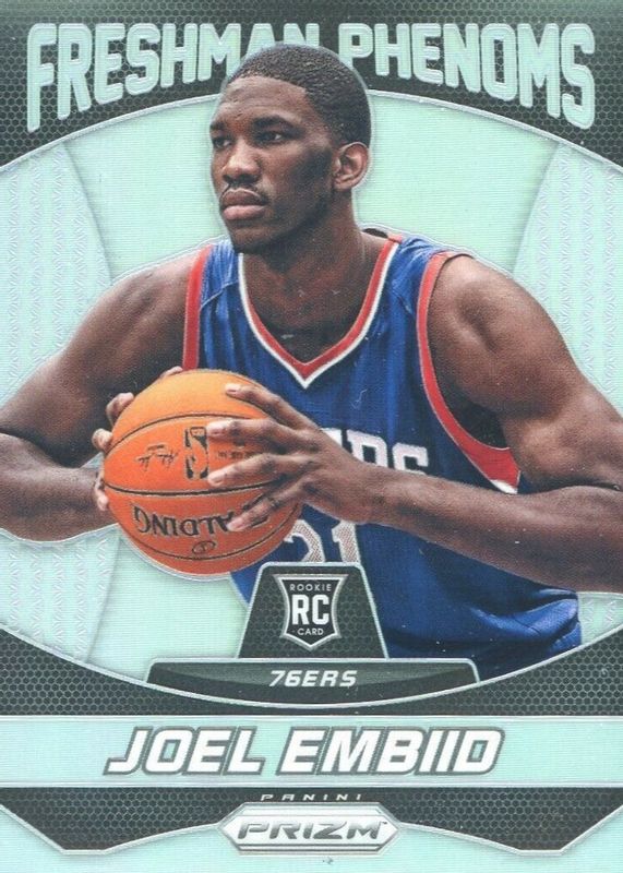 The Joel Embiid 2014 Prizm #3 Freshman Phenoms Rookie card in Raw condition has moved down -$1.89 (-21.3%) in the last 30 days and was last sold for $6.99 .