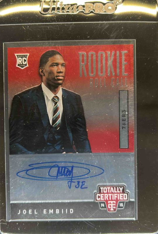The Joel Embiid 2014 Totally Certified #RRC-JE Rookie Roll Call Autographs /249 card is 1 of 26 Joel Embiid's card variations in the 2014 Totally Certified set being tracked by Sports Card Investor, including Base, Platinum Red /279, Platinum Blue /149, Mirror Platinum Red Die-Cut /135, and Mirror Platinum Blue Die-Cut /74.