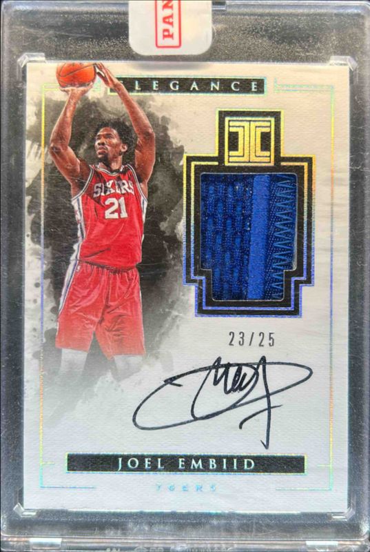 The Joel Embiid 2016 Impeccable #EV-JE Elegance Veteran Jersey Autographs - Holo Silver /25 card is 1 of 10 Joel Embiid's card variations in the 2016 Impeccable set being tracked by Sports Card Investor, including Base /99, Holo Silver /25, Holo Gold /10, Platinum /1, and Elegance Veteran Jersey Autographs /99.
