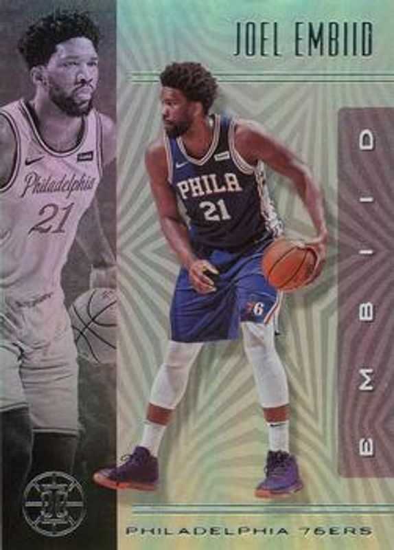 The Joel Embiid 2019 Illusions #63 Trophy Collection Emerald card is 1 of 50 Joel Embiid's card variations in the 2019 Illusions set being tracked by Sports Card Investor, including Base, Trophy Collection Bronze, Trophy Collection Orange, Trophy Collection Pink, and Trophy Collection Sapphire.