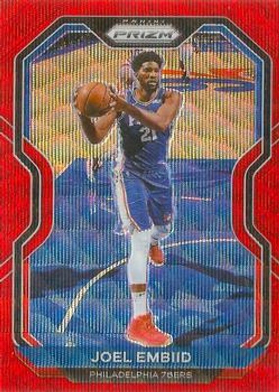 The Joel Embiid 2020 Prizm #141 Ruby Wave card is 1 of 59 Joel Embiid's card variations in the 2020 Prizm set being tracked by Sports Card Investor, including Choice Blue Yellow Green, Fast Break, Green, Green Ice, and Hyper.