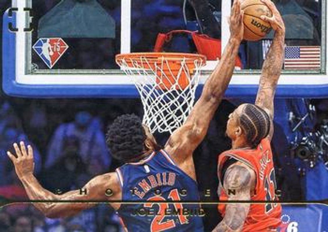 The Joel Embiid 2021 Photogenic #25 Base card is 1 of 8 Joel Embiid's card variations in the 2021 Photogenic set being tracked by Sports Card Investor, including Silver, Diamond Anniversary /75, Gold /10, Platinum /1, and With Authority.