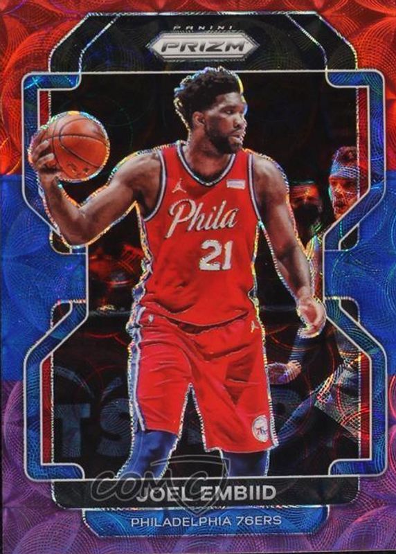 The Joel Embiid 2021 Prizm #176 Choice Red Blue & Purple /15 card in Raw condition has not changed in price in the last 30 days and was last sold for $31.00 .