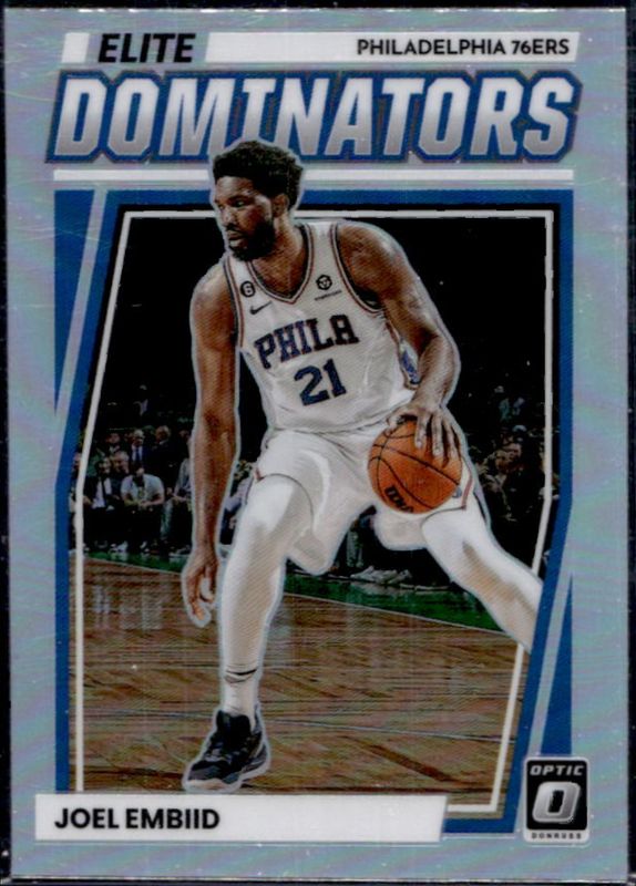 The Joel Embiid 2022 Optic #9 Elite Dominators - Holo card is 1 of 58 Joel Embiid's card variations in the 2022 Optic set being tracked by Sports Card Investor, including Base, Checkerboard, Choice Red & Green, Fast Break, and Green Shock.