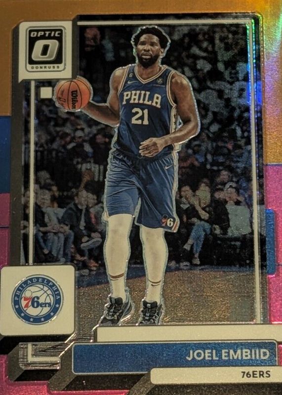 This card is 1 of 24 Joel Embiid's card variations in the 2022 Optic set being tracked by Sports Card Investor, including Choice Dragon /(SSP), Photon /(SSP), White Sparkle /(SSP), Black Velocity /39, and Fast Break Pink /25.