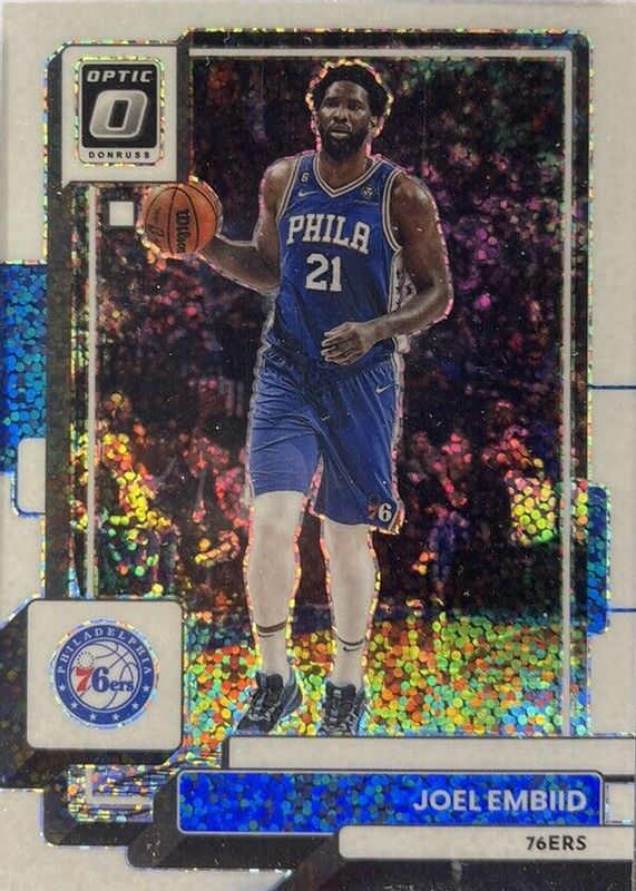 This card is 1 of 24 Joel Embiid's card variations in the 2022 Optic set being tracked by Sports Card Investor, including Choice Dragon /(SSP), Photon /(SSP), Black Velocity /39, Fast Break Pink /25, and Choice Blue Mojo /24.