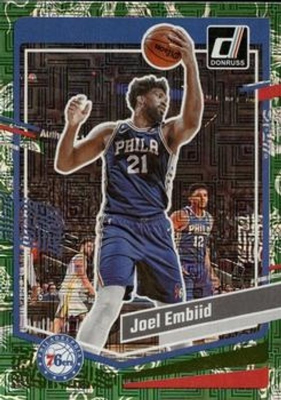 The Joel Embiid 2023 Donruss #110 Choice Dragon /(SSP) card is 1 of 66 Joel Embiid's card variations in the 2023 Donruss set being tracked by Sports Card Investor, including Base, Choice, Holo Green Laser, Holo Red & Gold Laser, and Press Proof Silver.