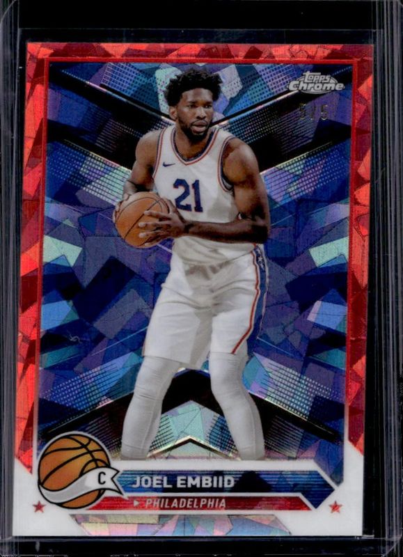 The Joel Embiid 2023 Topps Chrome Sapphire Edition #100 Red /5 card is 1 of 7 Joel Embiid's card variations in the 2023 Topps Chrome Sapphire Edition set being tracked by Sports Card Investor, including Base, Gold /50, Orange /25, Purple /10, and Padparadscha /1.