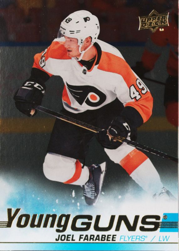 This card is 1 of 8 Joel Farabee's card variations in the 2019 Upper Deck set being tracked by Sports Card Investor, including Young Guns Base, Young Guns Canvas, Young Guns - Clear Cut, Young Guns - Clear Cut Exclusives, and Young Guns - Speckled Rainbow Foil.