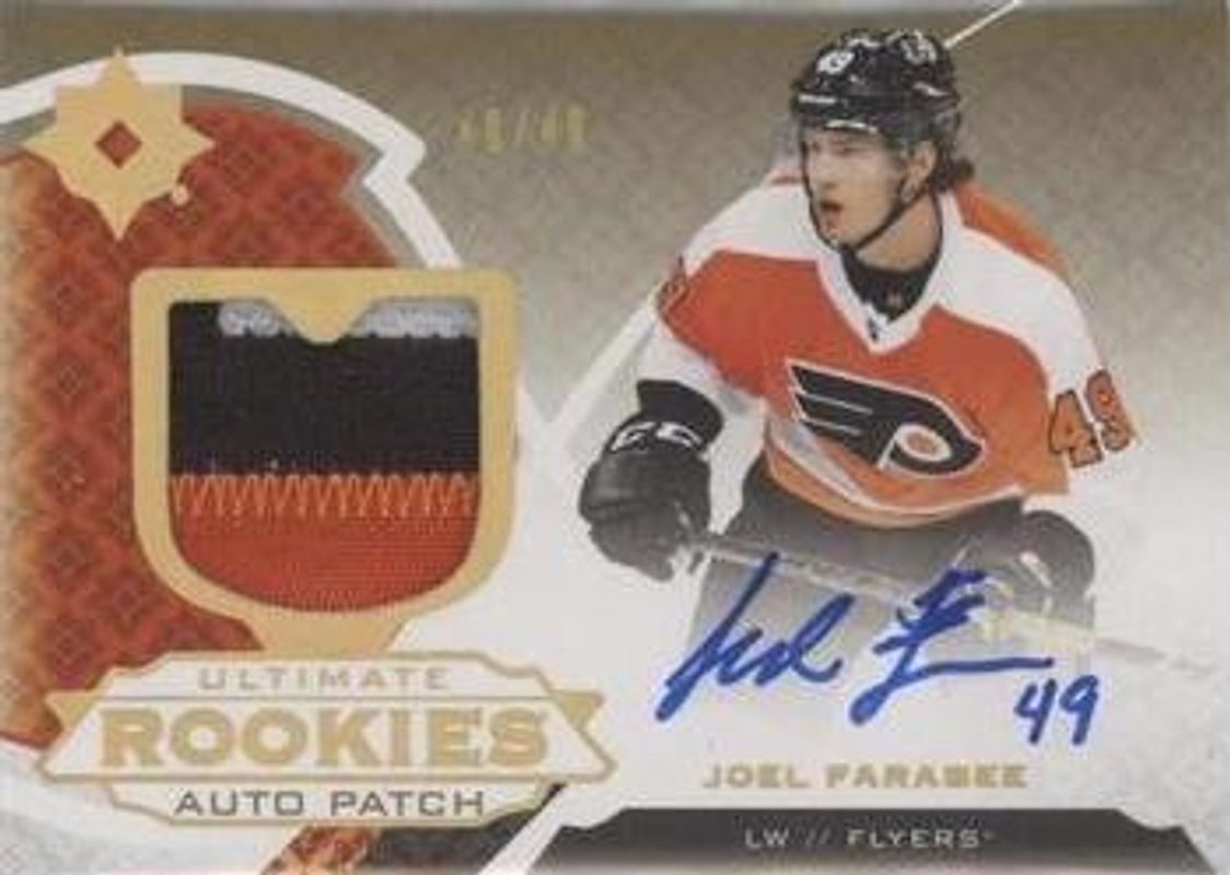 The Joel Farabee 2020 Upper Deck Ultimate Collection #197 2019 Upper Deck Ultimate Collection Update: Ultimate Rookies Auto Patch /99 card is 1 of 9 Joel Farabee's card variations in the 2020 Upper Deck Ultimate Collection set being tracked by Sports Card Investor, including 2019 Upper Deck Ultimate Collection Update I: Ultimate Introductions Gold Autographs, 2019 Upper Deck Ultimate Collection Update /299, 2019 Upper Deck Ultimate Collection Update: Retro Ultimate Rookies Autographed /225, 2019 Upper Deck Ultimate Collection Update: Autographed Debut Threads /99, and 2019 Upper Deck Ultimate Collection Update: Rookie Accents /65.