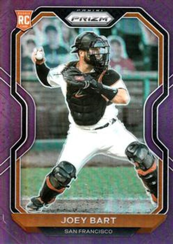 The Joey Bart 2021 Prizm #78 Purple Rookie card is 1 of 114 Joey Bart's card variations in the 2021 Prizm set being tracked by Sports Card Investor, including Base, Blue, Blue Velocity, Carolina Blue, and Cosmic Haze.