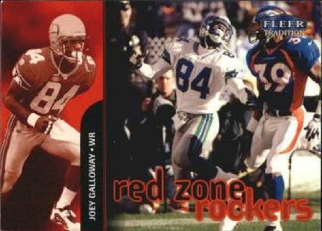 The Joey Galloway 1998 Fleer Tradition #5-RR Red Zone Rockers card is 1 of 4 Joey Galloway's card variations in the 1998 Fleer Tradition set being tracked by Sports Card Investor, including Base, Heritage /125, and Playmakers Theatre /100.