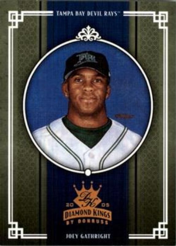 The Joey Gathright 2005 Diamond Kings #226 Bronze /50 Rookie card is 1 of 88 Joey Gathright's card variations in the 2005 Diamond Kings set being tracked by Sports Card Investor, including Base, Black & White, Framed Red, Framed Red Black & White, and Non Canvas.