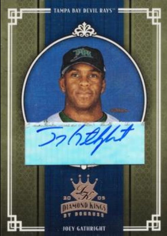 The Joey Gathright 2005 Diamond Kings #226 Signatures - Bronze /50 Rookie card is 1 of 88 Joey Gathright's card variations in the 2005 Diamond Kings set being tracked by Sports Card Investor, including Base, Black & White, Framed Red, Framed Red Black & White, and Non Canvas.