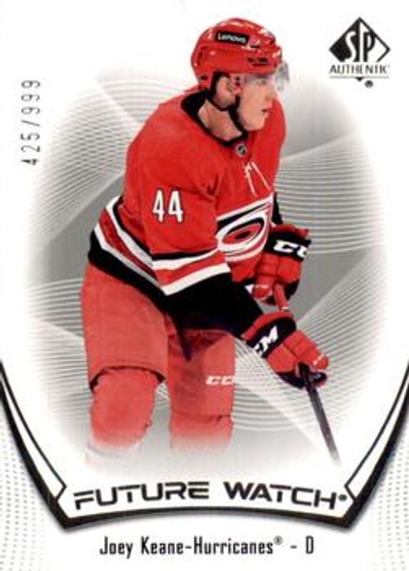 The Joey Keane 2021 SP Authentic #126 Future Watch Auto /999 Rookie card is 1 of 7 Joey Keane's card variations in the 2021 SP Authentic set being tracked by Sports Card Investor, including Black Autographs, Limited Red, Limited Gold /99, Limited Black /1, and Future Watch Acetate.