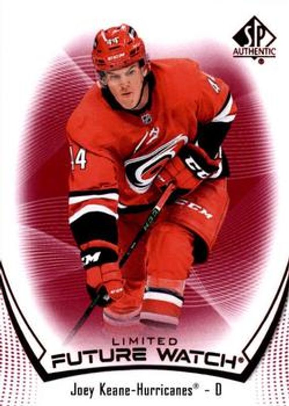 The Joey Keane 2021 SP Authentic #126 Limited Red Rookie card is 1 of 7 Joey Keane's card variations in the 2021 SP Authentic set being tracked by Sports Card Investor, including Black Autographs, Limited Gold /99, Limited Black /1, Future Watch Acetate, and Upper Deck Young Guns Acetate.