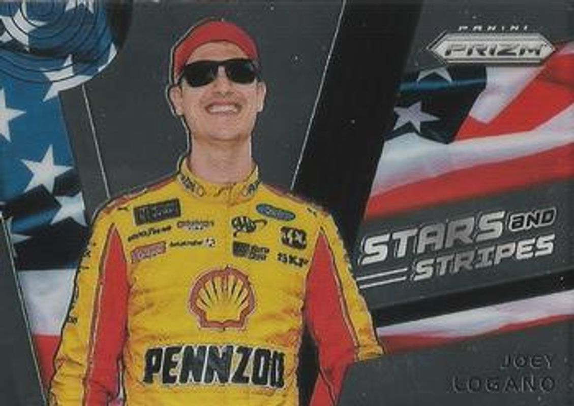 The Joey Logano 2018 Prizm NASCAR #SS-13 Stars & Stripes card is 1 of 50 Joey Logano's card variations in the 2018 Prizm NASCAR set being tracked by Sports Card Investor, including #73 Base, #45 Base, #73 Camo, #45 Camo, and #45 Purple Flash.