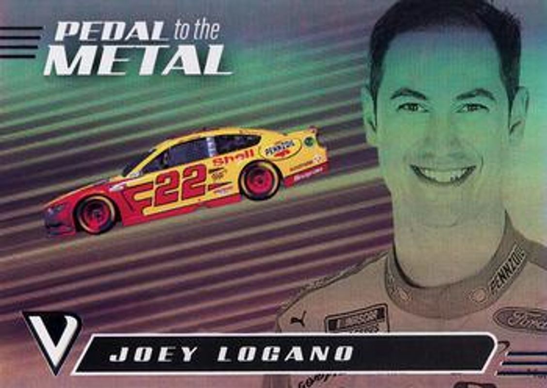 The Joey Logano 2021 Chronicles NASCAR #10 Pedal to the Metal card is 1 of 126 Joey Logano's card variations in the 2021 Chronicles NASCAR set being tracked by Sports Card Investor, including Absolute, Absolute Autographs, Black, Black Autographs, and Black - Green.
