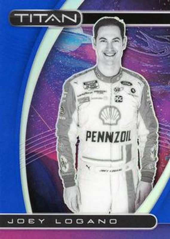 The Joey Logano 2021 Chronicles NASCAR #10 Titan - Blue /199 card is 1 of 126 Joey Logano's card variations in the 2021 Chronicles NASCAR set being tracked by Sports Card Investor, including Absolute, Absolute Autographs, Black, Black Autographs, and Black - Green.