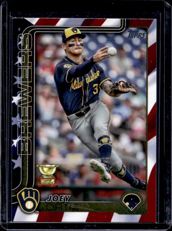 The Joey Ortiz 2025 Topps #165 Independence Day /76 card is 1 of 76 Joey Ortiz's card variations in the 2025 Topps set being tracked by Sports Card Investor, including Base, Aqua Holo Foil, Diamante Foil, Holo Foil, and Pink Diamante Foil.