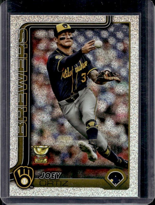 The Joey Ortiz 2025 Topps #165 Sandglitter card is 1 of 76 Joey Ortiz's card variations in the 2025 Topps set being tracked by Sports Card Investor, including Base, Aqua Holo Foil, Diamante Foil, Holo Foil, and Pink Diamante Foil.