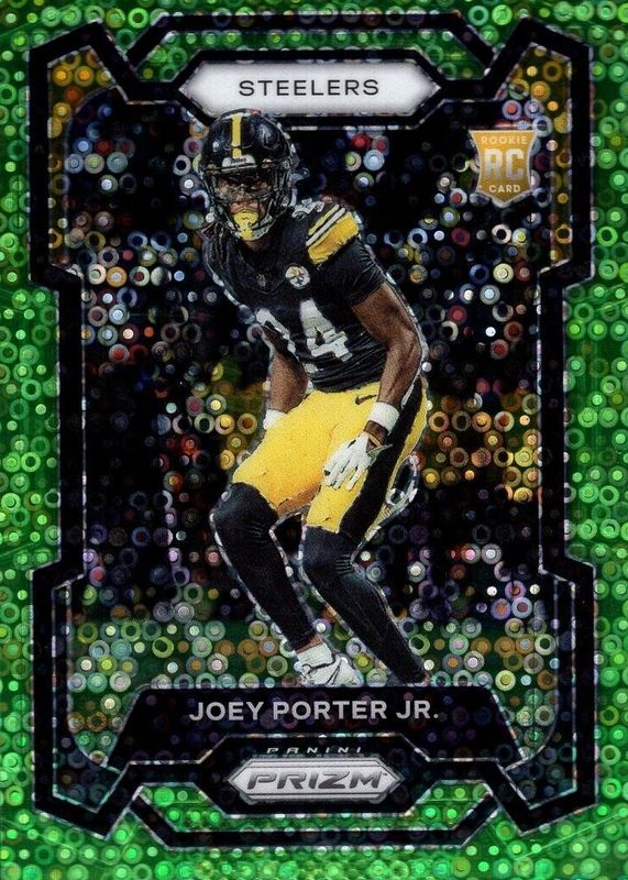 The Joey Porter Jr. 2023 Prizm #386 No Huddle Neon Green /5 Rookie card in Raw condition has not changed in price in the last 30 days and was last sold for $95.00 .