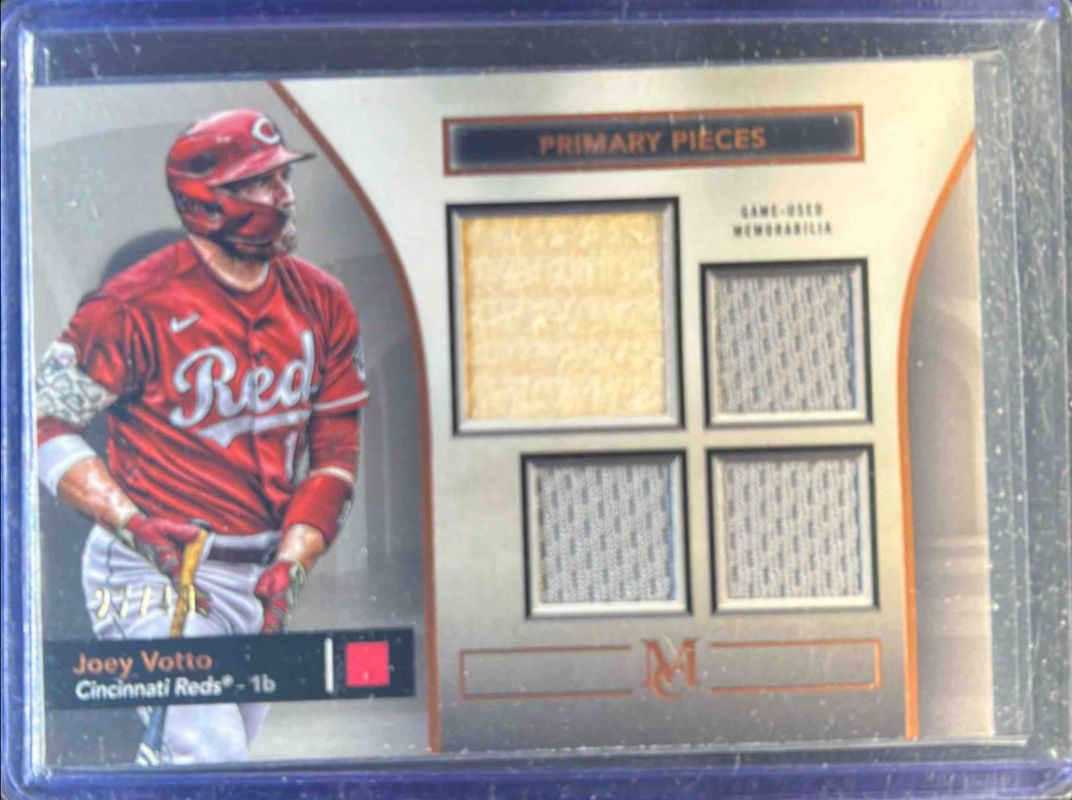 The Joey Votto 2024 Topps Museum Collection #SPPQ-JV Single Player Primary Pieces Quad Relics - Copper /49 card is 1 of 32 Joey Votto's card variations in the 2024 Topps Museum Collection set being tracked by Sports Card Investor, including Meaningful Materials Relics /99, Single Player Primary Pieces Quad Relics /99, Meaningful Materials Relics - Copper /49, Meaningful Materials Relics - Gold /35, and Meaningful Materials Relics - Sapphire /25.