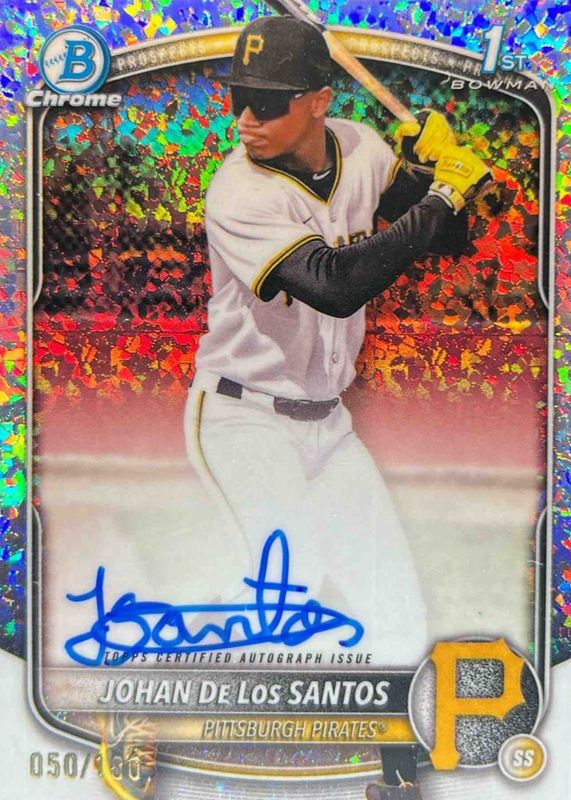 The Johan De Los Santos 2025 Bowman Chrome #CPA-JDLS Prospect Auto - Mini-Diamond Refractor /100 (1st) card in Raw condition has not changed in price in the last 30 days and was last sold for $47.00 .