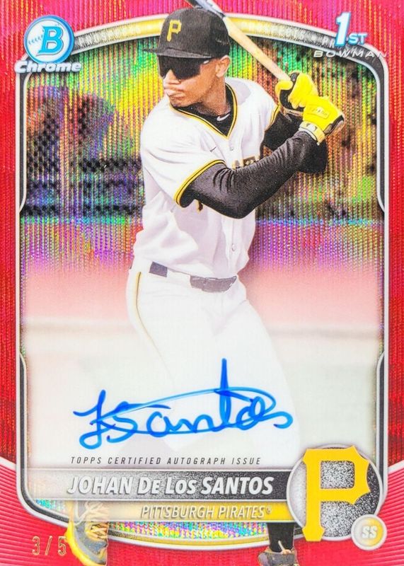 The Johan De Los Santos 2025 Bowman Chrome #CPA-JDLS Prospect Auto - Red Wave Refractor /5 (1st) card in Raw condition has not changed in price in the last 30 days and was last sold for $391.00 .