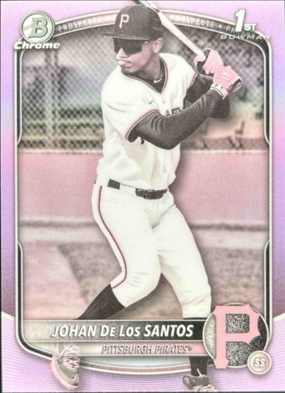 This card is 1 of 88 Johan De Los Santos' card variations in the 2025 Bowman Chrome set being tracked by Sports Card Investor, including International Refractor Variation, Prospect Auto (1st), Prospect Auto - Black & White Shimmer Refractor (1st), Prospects (1st), and Prospects - Mini-Diamond Refractor (1st).