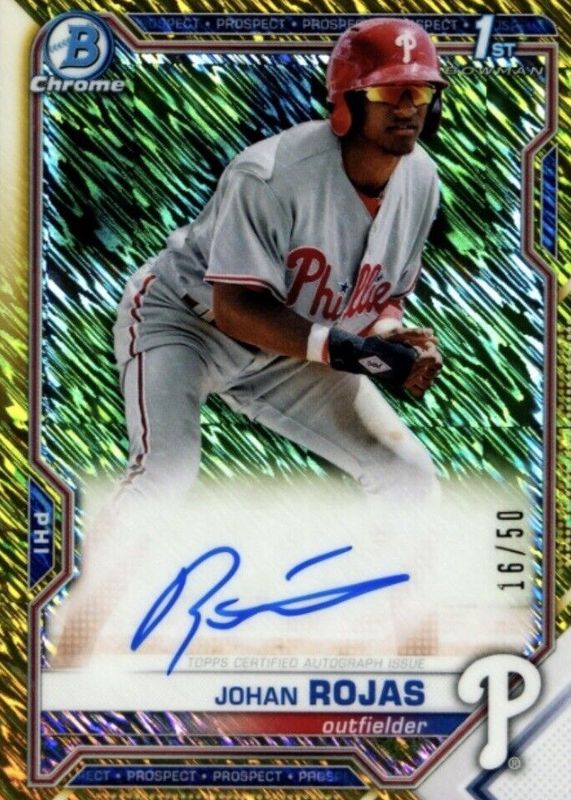 This card is 1 of 16 Johan Rojas' card variations in the 2021 Bowman set being tracked by Sports Card Investor, including Chrome Prospect Auto (1st), Chrome Prospect Auto - Refractor /499 (1st), Chrome Prospect Auto - Speckle Refractor /299 (1st), Chrome Prospect Auto - Purple Refractor /250 (1st), and Chrome Prospect Auto - Blue Refractor /150 (1st).