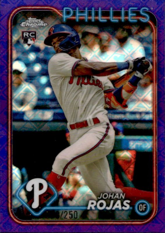 The Johan Rojas 2024 Topps Chrome Logofractor Edition #273 Purple /250 Rookie card is 1 of 10 Johan Rojas' card variations in the 2024 Topps Chrome Logofractor Edition set being tracked by Sports Card Investor, including Base, Aqua /199, Blue /150, Green /99, and Gold /50.