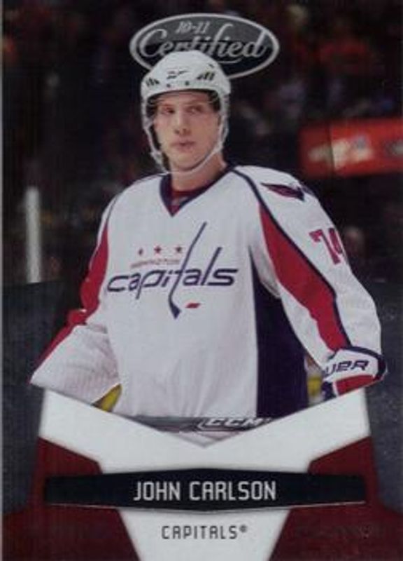 The John Carlson 2010 Certified #148 Platinum Red /999 card is 1 of 42 John Carlson's card variations in the 2010 Certified set being tracked by Sports Card Investor, including Base /799, Platinum Blue /250, Mirror Red Materials Dual /150, Mirror Blue Materials /100, and Mirror Red /100.