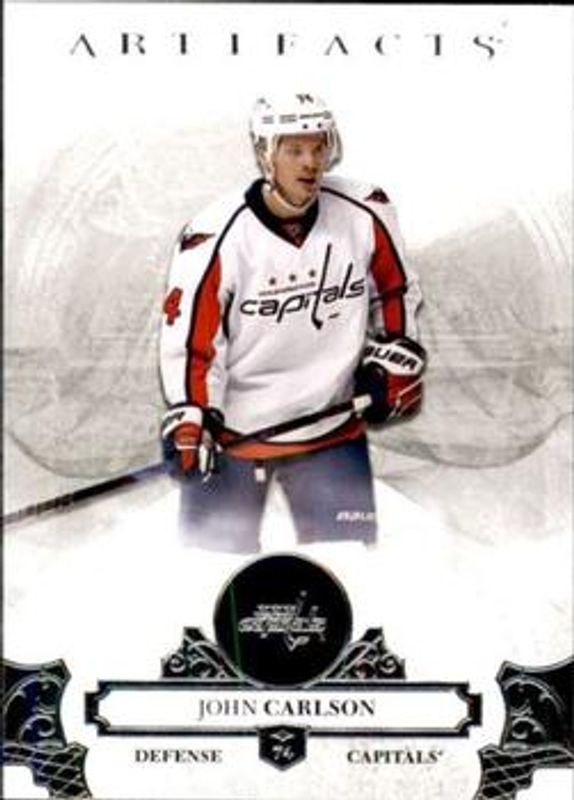 The John Carlson 2017 Upper Deck Artifacts #23 Base /799 card is 1 of 13 John Carlson's card variations in the 2017 Upper Deck Artifacts set being tracked by Sports Card Investor, including Materials Silver /125, Auto Material Silver /99, Emerald /99, Orange /55, and Auto Material Emerald /25.