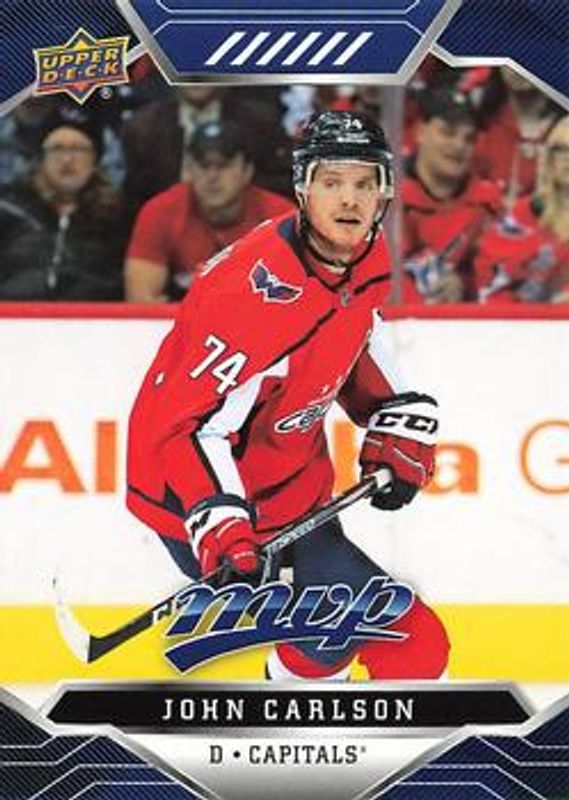 The John Carlson 2019 Upper Deck MVP #35 Blue card is 1 of 17 John Carlson's card variations in the 2019 Upper Deck MVP set being tracked by Sports Card Investor, including Base, Gold Script, Puzzle Backs, Silver Script, and Super Script /25.