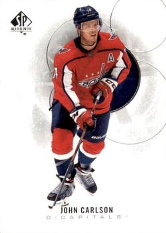 The John Carlson 2020 SP Authentic #23 Base /999 card is 1 of 6 John Carlson's card variations in the 2020 SP Authentic set being tracked by Sports Card Investor, including Limited Red, 2000 Retro, Spectrum FX, 2000 Retro Spectrum /100, and Spectrum FX - Gold /50.