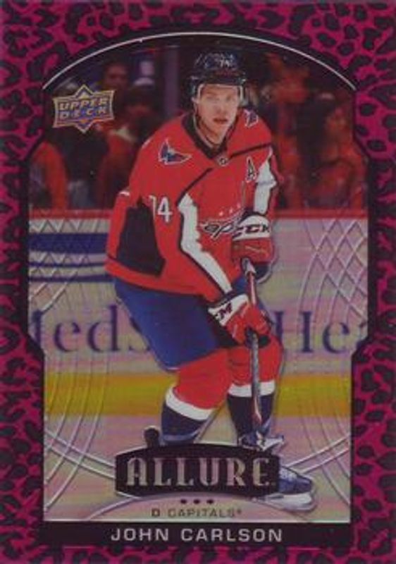 The John Carlson 2020 Upper Deck Allure #40 Pink Leopard card is 1 of 27 John Carlson's card variations in the 2020 Upper Deck Allure set being tracked by Sports Card Investor, including Base, 2005 Shield, Black Rainbow, Blue China, and Leopard.
