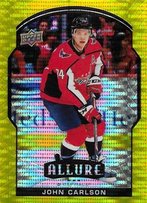The John Carlson 2020 Upper Deck Allure #40 Yellow Taxi card is 1 of 27 John Carlson's card variations in the 2020 Upper Deck Allure set being tracked by Sports Card Investor, including Base, 2005 Shield, Black Rainbow, Blue China, and Leopard.