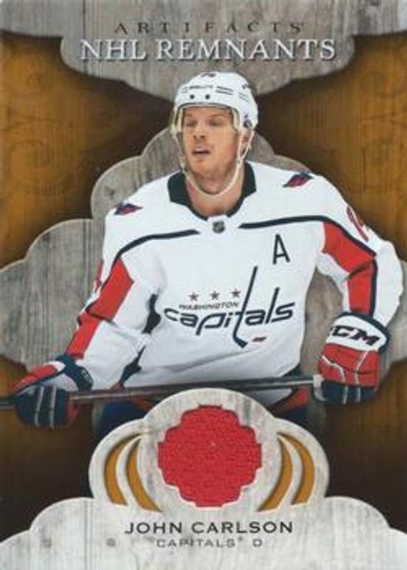 The John Carlson 2021 Upper Deck Artifacts #NR-JC NHL Remnants card is 1 of 23 John Carlson's card variations in the 2021 Upper Deck Artifacts set being tracked by Sports Card Investor, including Base /999, Neon Green, Rose Gold, Turquoise, and Ruby /499.