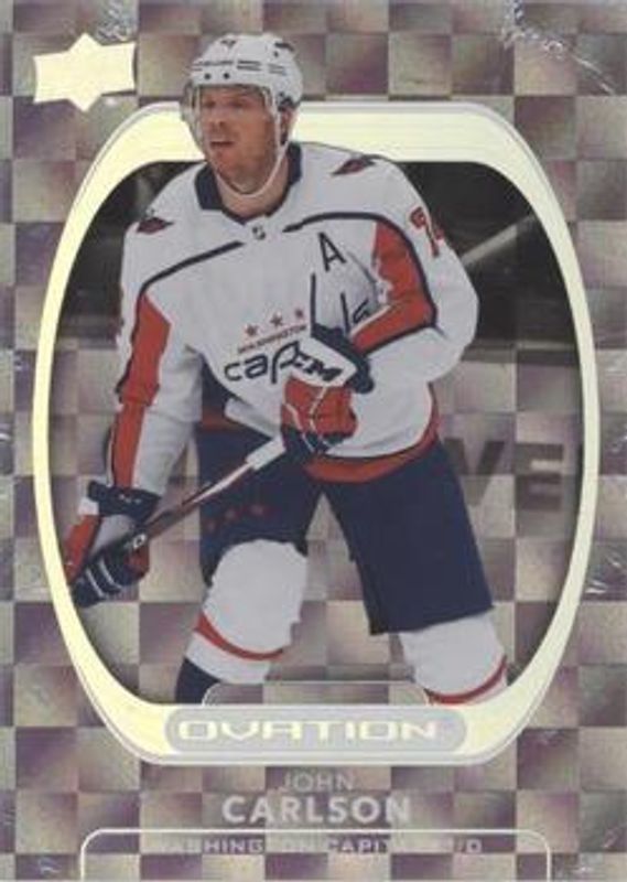 The John Carlson 2021 Upper Deck Ovation #48 Checkerboard card is 1 of 13 John Carlson's card variations in the 2021 Upper Deck Ovation set being tracked by Sports Card Investor, including Base, Gold Circular Wonder, Gold Foil, Silver Foil, and Standing Ovation /500.